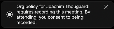 Initiate a few test calls to one or more of the users who have now been activated for recording. You should see a banner in Teams during these calls that reads, "Org policy for [Name] required recording this meeting. By attending, you consent to being recorded."