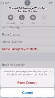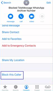 Open your iPhone contacts, and locate the “Blocked TeleMessage WhatsApp Archiver Number” contact.